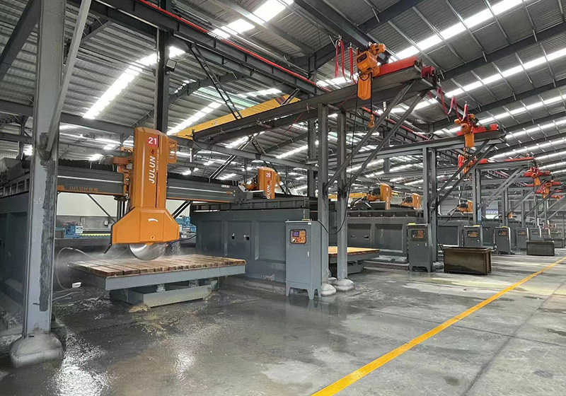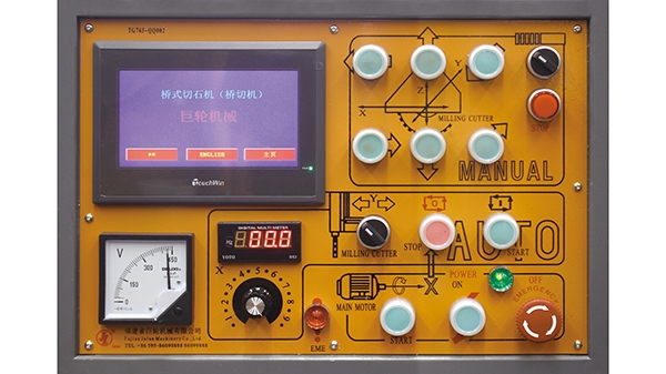 該機采用PLC可編程控制系統(tǒng)和人機操作界面,輔以高精度旋轉(zhuǎn)編碼器定位及紅外線標線器,左右行走及前后分片采用雙變頻器控制,可根據(jù)石材材質(zhì)進行調(diào)速,上下升降采用液壓升降,結(jié)合鍍鉻導柱+耐磨導套,配合間隙小,耐磨美觀,并在導套內(nèi)設(shè)計多層密封,防水防塵防漏油,提高使用壽命。工作臺采用超重型大規(guī)格型材焊接而成,承載重量更大,更穩(wěn)固耐用。關(guān)鍵部位均采用進口零部件,因而具有切割效率高、穩(wěn)定性高、操作簡便等優(yōu)點,特別適用于異形、墓碑、路沿石的切割。
